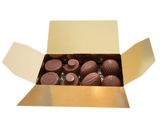 Assortiment de bonbons de chocolat au lait 40% crémeux et cacaoté : ganaches subtiles, onctueux pralinés, traditionnel caramel beurre salé, pâte d’amande parfumée ou pâte naturelle de pistache au goût intense.